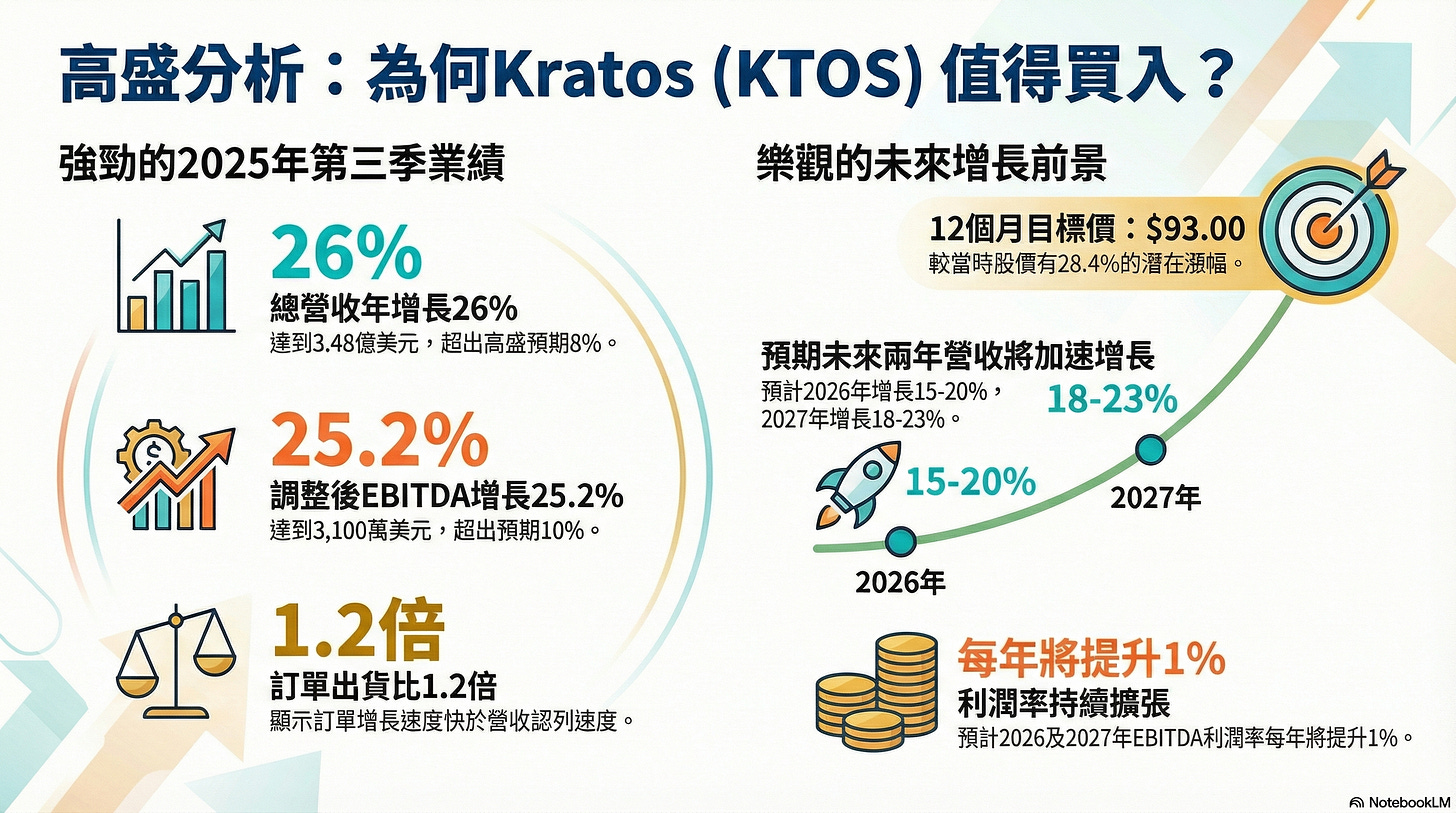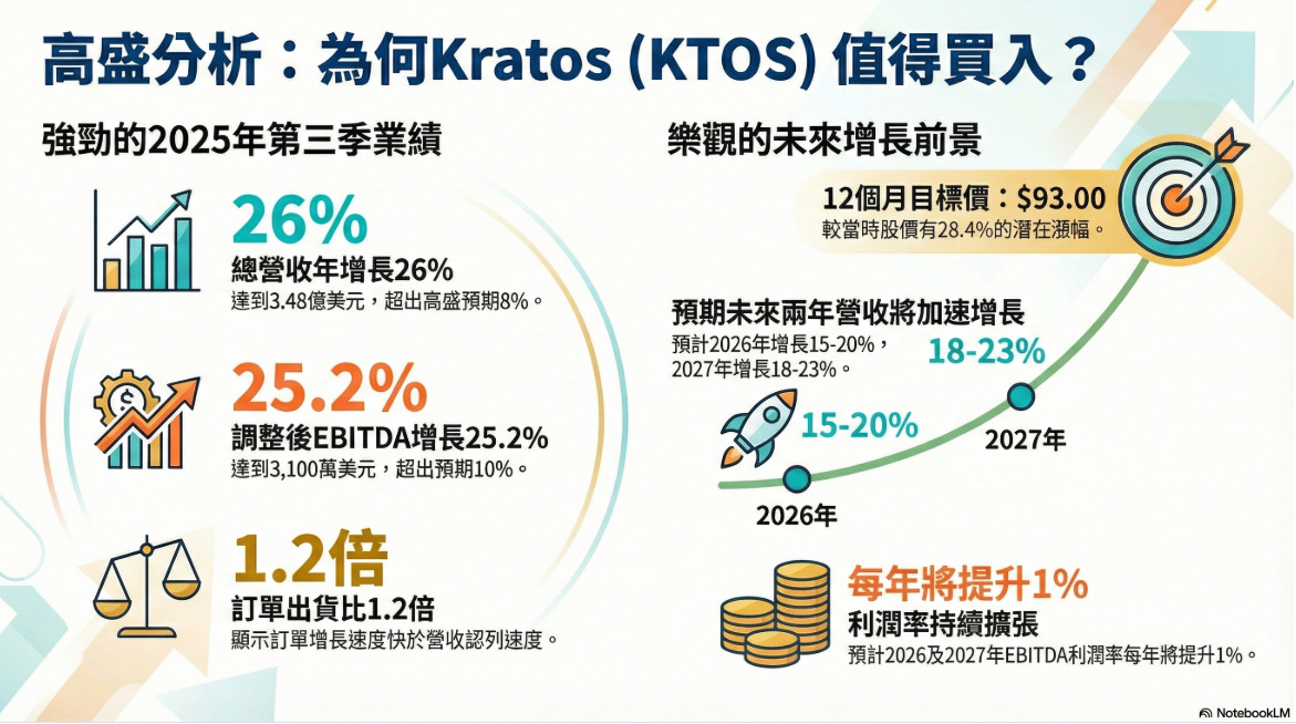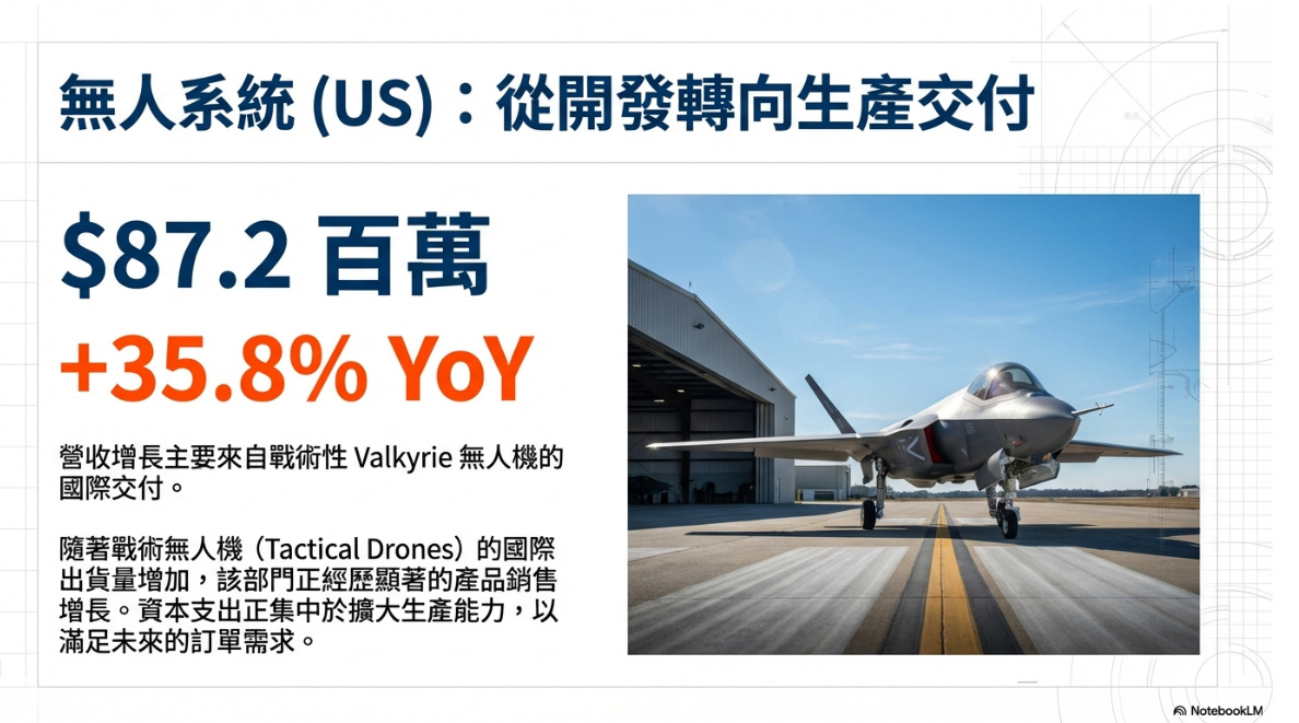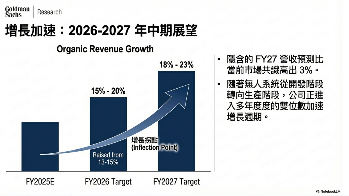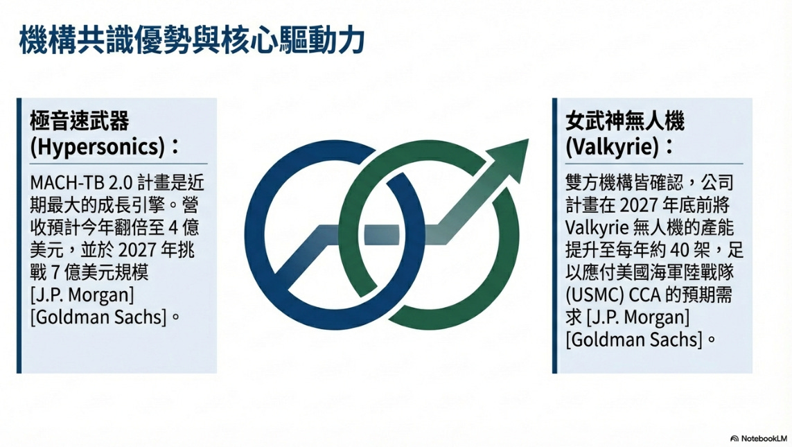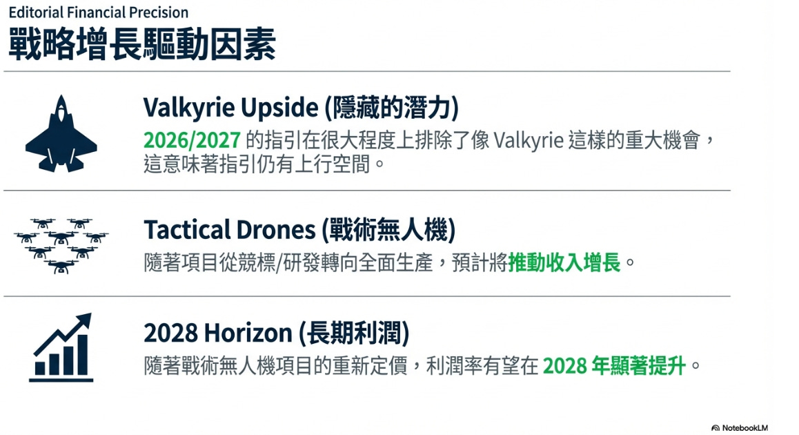 無人系統 (KUS):是整體營收成長最快的引擎,其無人機與靶機的成功,證明其長期投資策略的正確性與前瞻性。GS 預期 Valkyrie 等重大機會,在很大程度上尚未被納入目前的財務預測中,這代表著未來營收存在顯著的上行空間。此外,管理層預期在 2028 年,隨著戰術無人機計畫從開發階段轉向規模化生產,並進行合約重新定價,該部門的利潤率將有潛力實現大幅提升,為公司帶來更豐厚的獲利回報。