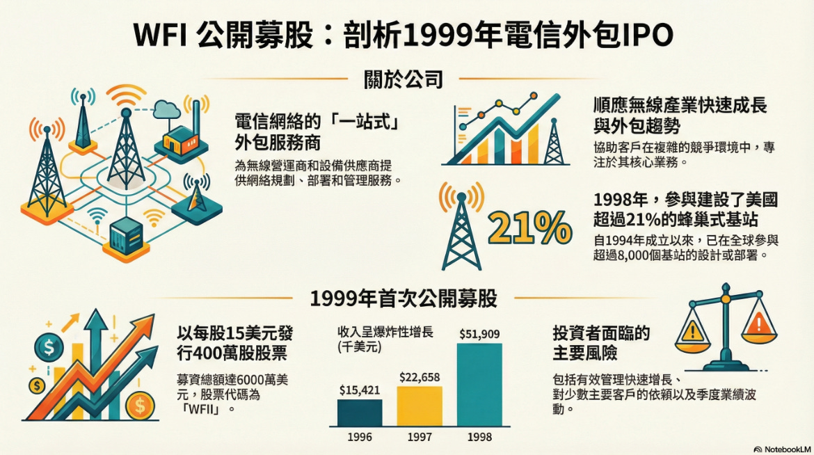 然而,其前三大客戶(Telecorp, Qualcomm, Triton PCS)貢獻 67% 的營收。這種高客戶集中度,雖顯示出大客戶的信任,但也暗是 WFI 對大型合約的高度依賴。