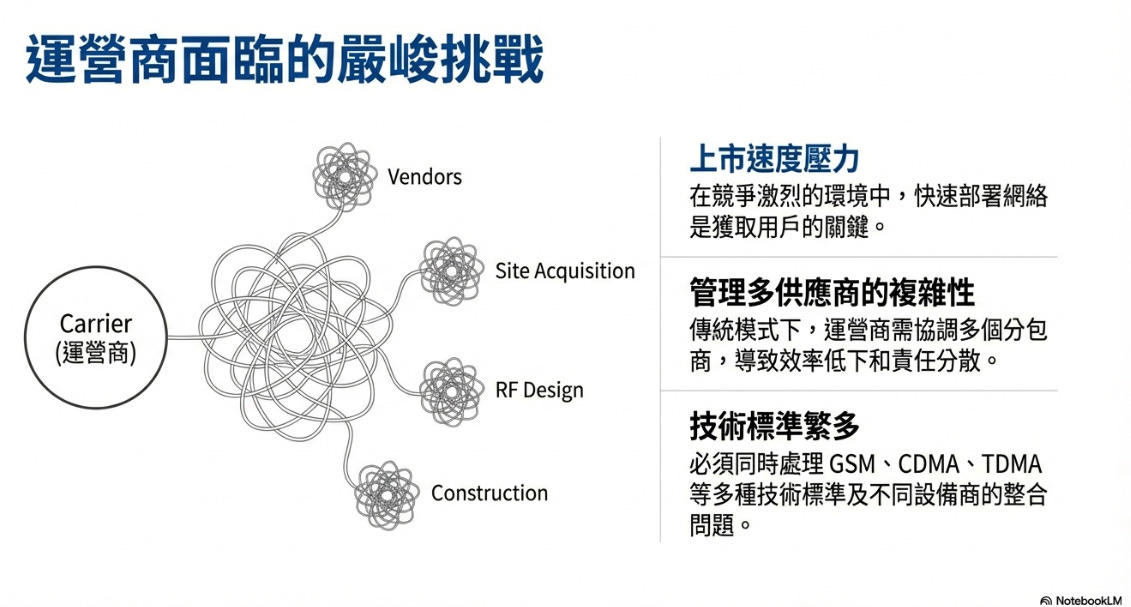 多供應商的管理複雜性:營運商需協調設備商(Vendor)、選址商(Site Acquisition)、設計工程師(RF Design)與施工方,這種「多對多」的溝通模式導致管理摩擦極大,出問題時分包商互推責任。