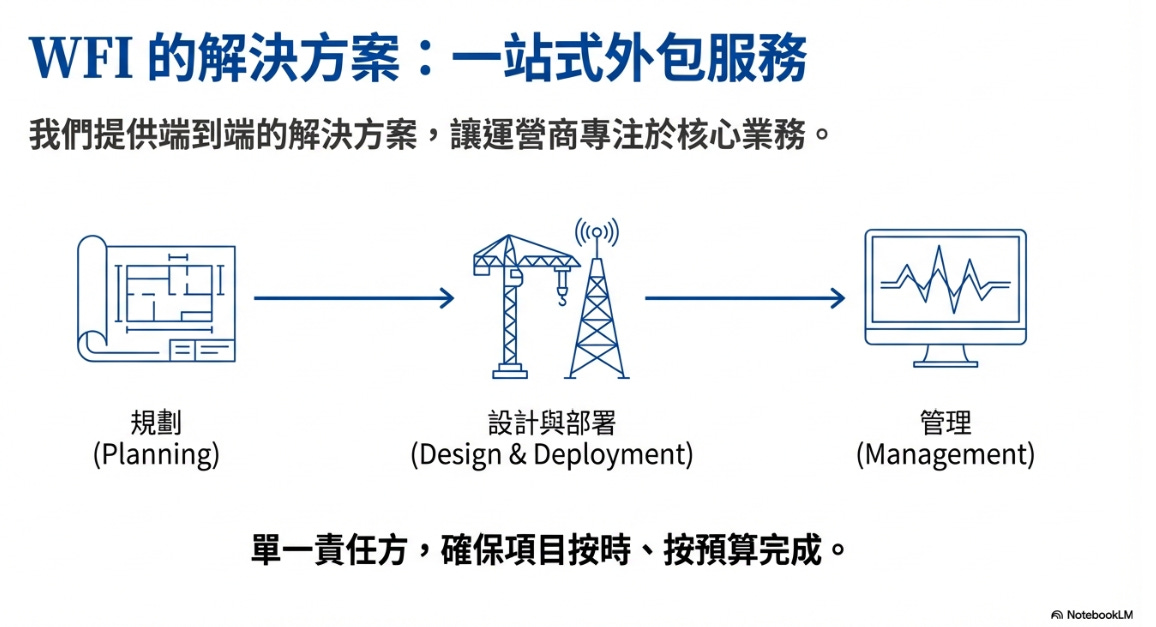 固定價格 (Fixed-Price) 與保證時限: 這是強大的行銷工具。營運商的 CFO 最痛恨預算超支與進度延宕,WFI 透過風險轉移,將原本由客戶承擔的執行風險全部攬在自己身上。
