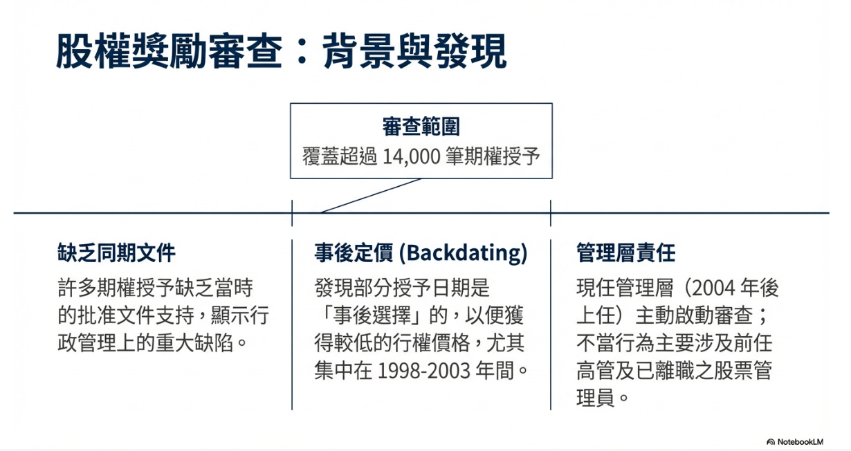 內部審查發現,在 1998 年至 2003 年期間 ,部分股票期權的授予日期是「事後選擇」的(Backdating),目的是挑選股價較低的時間點,以便讓持有人獲得更大利益。這種行為缺乏同期的批准文件,顯示行政管理上的重大缺陷。此不當行為主要涉及前任高管及已離職的 stock option administrator ,相關人員甚至因此面臨刑事指控並認罪。