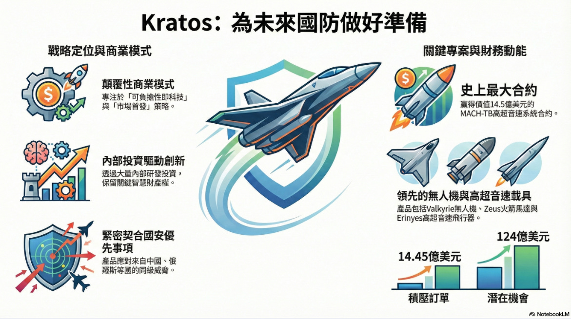 「固定價格與保證時限」的成本控制基因 (Fixed-price, Time-certain) : WFI 早期在為電信營運商部署無線網路時,主打「固定價格、保證時限」的一站式外包模式。這種對成本預算和時間表嚴格控管的營運 DNA,直接演變成今日 KTOS 最大的競爭優勢,可負擔性本身就是一種技術 (Affordability is a technology)。這使 KTOS 能以低成本、快速量產的模式,顛覆傳統國防承包商往往超支、延宕的陋習,從而在國防預算緊縮的環境下脫穎而出。