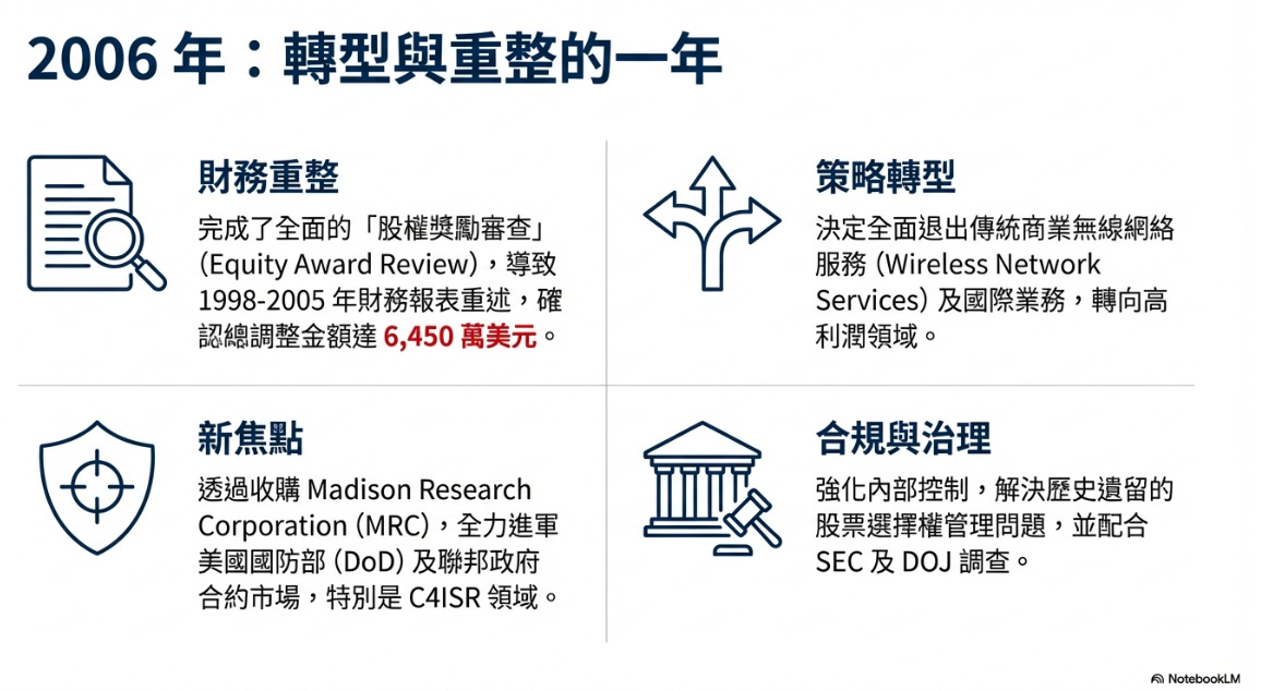 其業務架構轉為以聯邦預算驅動的成長引擎,營收來源已與國防預算高度掛鉤,2007 財務年年達 1.936 億。