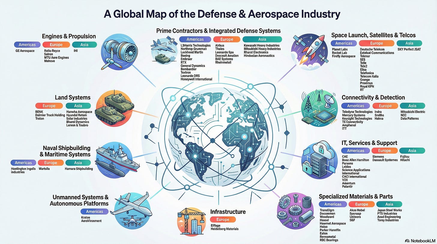 1. 主要承包商與整合防禦系統 (Prime Contractors & Integrated Defense Systems):不一定親自製造每個零件,但會整合來自不同供應商的技術、系統與組件,去打造複雜的防禦系統,例如一架戰鬥機、一艘軍艦或一套導彈防禦網絡。他們是國防生態系的核心,需要頂尖的工程技術,更需要卓越的專案管理能力去協調數不清的下游供應商。要建造 F-35 隱形戰機,LMT 須依賴「特殊材料與零件」企業提供先進複合材料,並與「引擎與推進系統」企業合作開發高性能發動機。