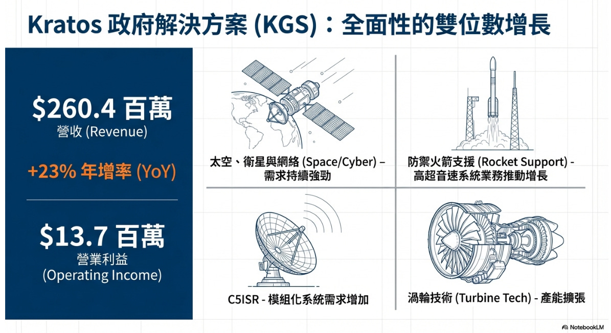 政府解決方案 (KGS) :此部門涵蓋衛星通訊、火箭支援、微波電子等多項業務,為 KTOS 提供穩定且可預測的收入基礎,扮演著支持高成長業務的穩固後盾