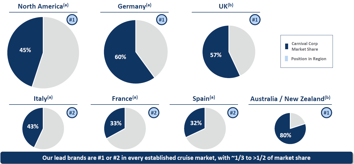 CCL 的營收主要來自於美國跟澳洲市場 (NNA),根據 CCL 自己對 2024 年的預估,以載客數來排名,主要是佔率都至少超過1/3,在北美跟澳洲的市占率都是第一名,連在德國和英國也是排第一。