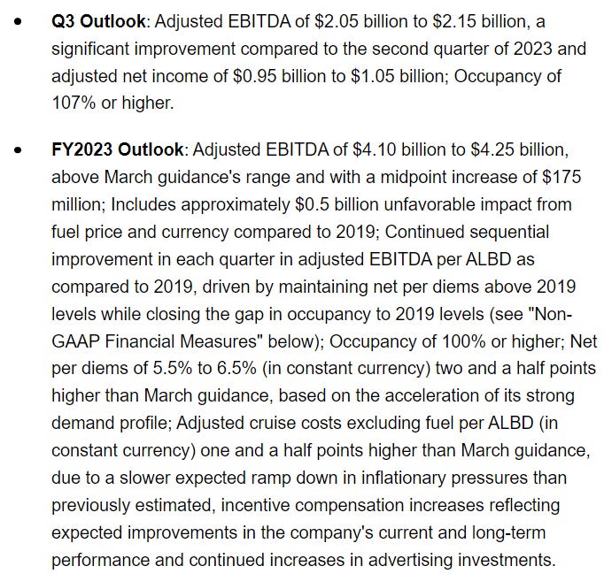 FY23Q2 的表現,大概就是營收持續成長,虧損大幅減少,這還不是股價大漲的原因,主要是第三季展望,很明顯地看到,載客率終於要破百了,調整後的淨利也轉虧為盈,要知道這對於 2020 年疫情以來最倒楣的產業來說,有多麼難得。