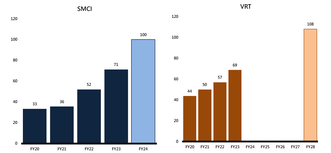 成長率:相對於 VRT,SMCI 的成長率非常快;兩者在 2022 年的營收規模相當,但受惠於 AI 伺服器的營收占比多寡的關係,所以 SMCI 可以在 FY24 就可以達到 100 億美元的規模,而 VRT 則要等到 FY28;