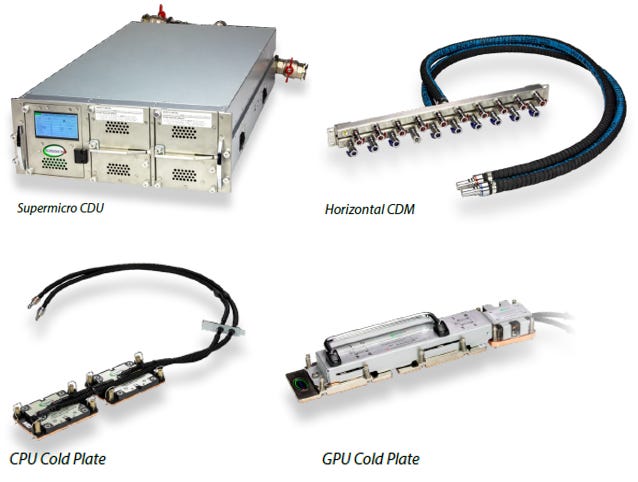 冷卻劑分配裝置 (Cooling Distribution Unit,CDU) :配管設計,包含泵送系統,推動液體流動,負責冷卻液的補充或是再冷卻;