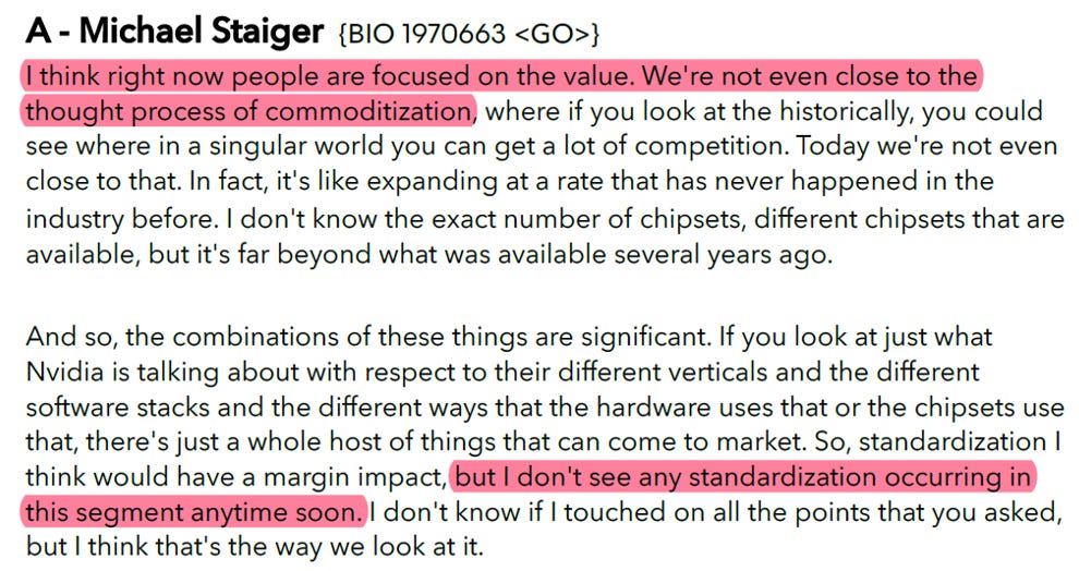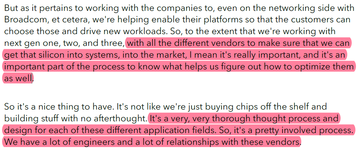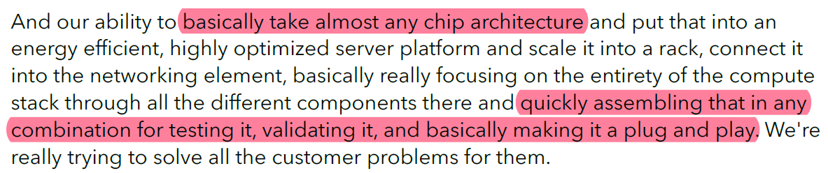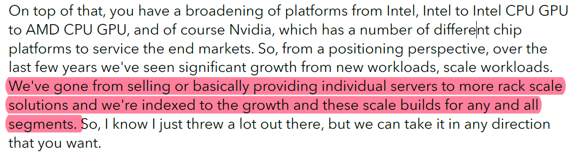目前市場積極想要加快 AI 的訓練、推理的前提下,SMCI 能夠拿到 NVDA 的GPU、機櫃可以隨到隨用,並附上水冷系統,可為資料中心的客戶省下時間與金錢,是不是就比其他伺服器廠商具有優勢?
