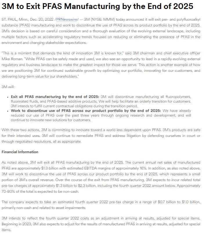 3M 宣布將在 2025 年底前停止生產所有的含氟聚合物、含氟液體和基於PFAS (polyfluoroalkyl substances)的添加劑產品,2025 年底前停止在其所有產品中使用 PFAS,