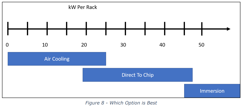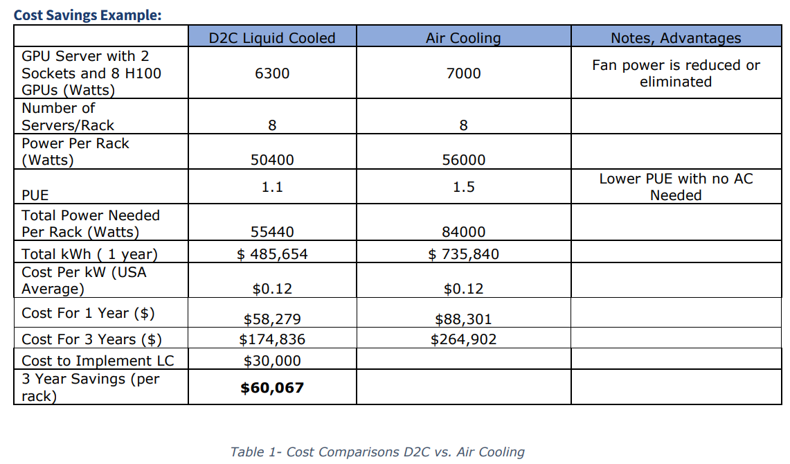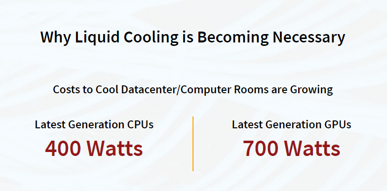 過去的資料中心多使用氣冷 (伺服器吹冷氣);但因目前的耗能太高,改為液冷的的好處是,若不用空調等氣冷方案,不僅省去大型風扇和散熱器等冷卻設備的空間,還可再放更多的CPU和GPU;