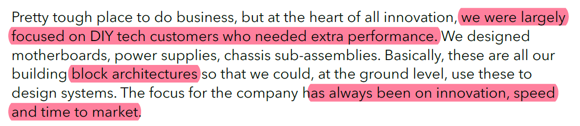 天下武功,唯快不破,盡快出貨滿足資料中心客戶的需求,協助客戶降低營運成本外,還讓客戶盡快推出新產品搶市,以維持競爭力,幫助客戶成長的商業模式(Businesses Model),讓他不只是靠著管理階層(Management)而成長;