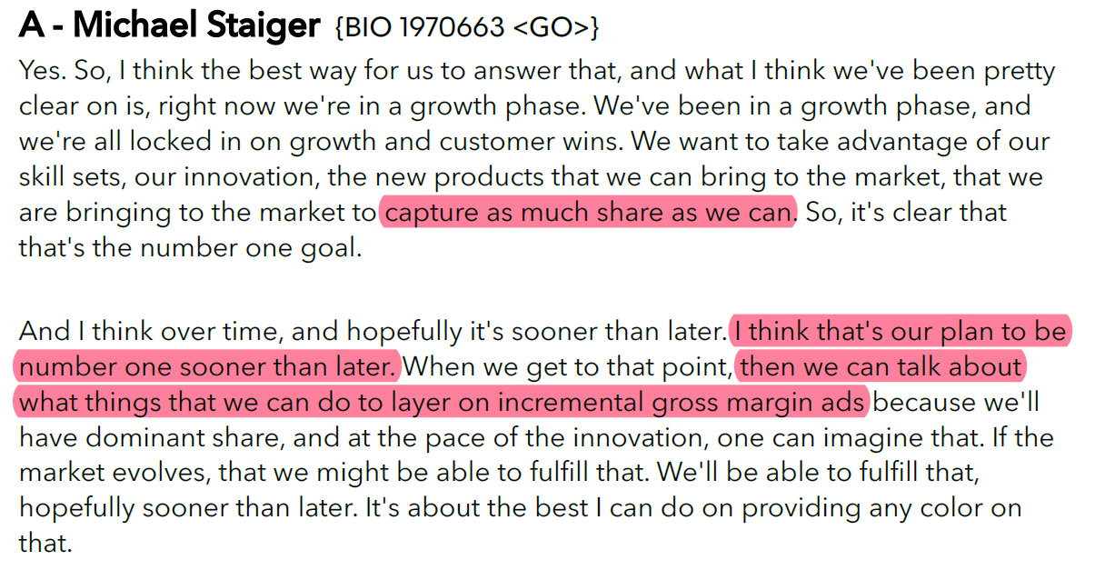 另一方面,市場普遍擔心 AI 伺服器與新工廠上線,會影響到 SMCI 的毛利率與獲利率,但 SMCI 表示,目前相關產品離被商品化(Commoditization) 還很遠,競爭對手還不是很多,因此目前的目標是盡量擴大市佔,預估很快就可以成為市場上最大的玩家,到時候就可以想辦法來提升獲利率,這基本上跟 NVDA 目前的作法雷同;