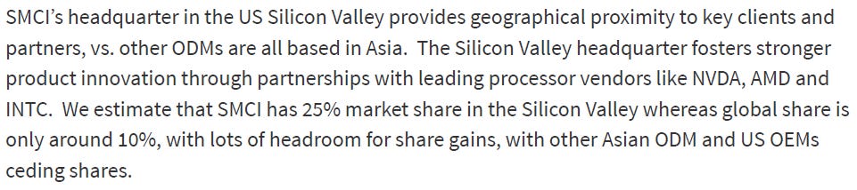 巴克萊認為 SMCI 在矽谷的總部也帶來優勢 - 和 NVDA、AMD 與 Intel 建立良好關係 ,估算其在矽谷的市佔率高達 25%,全球市佔率僅 7% ,還有很大的向上成長空間,尤其是月產能提早自 4000 台提升至 5000台,有機會帶動營收成長 (同時新廠在初期可能會影響毛利);