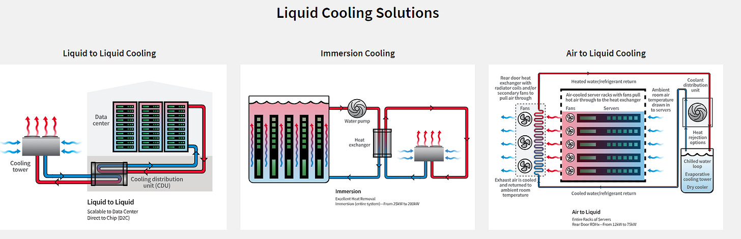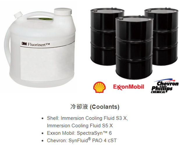 冷卻液體 (Coolants):液體比空氣的熱傳導率(Thermal Conductivity)高,換成液體來散熱,散熱能力就可以增加很多;在設計液冷解決方案,個別廠商都有不同的優勢;不管是哪個液冷解決方案,都需要冷卻液體; 在選擇合適的冷卻液時,需考慮: