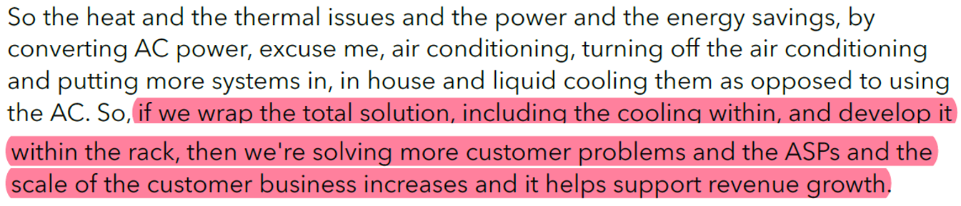 SMCI 專注於為客戶打造更好的解決方案,因此如果客戶需要液冷系統,SMCI 就會開始著手進行,除了最佳配置、最低功耗外,再加上最佳冷卻,真正為客戶提供整體解決方案;