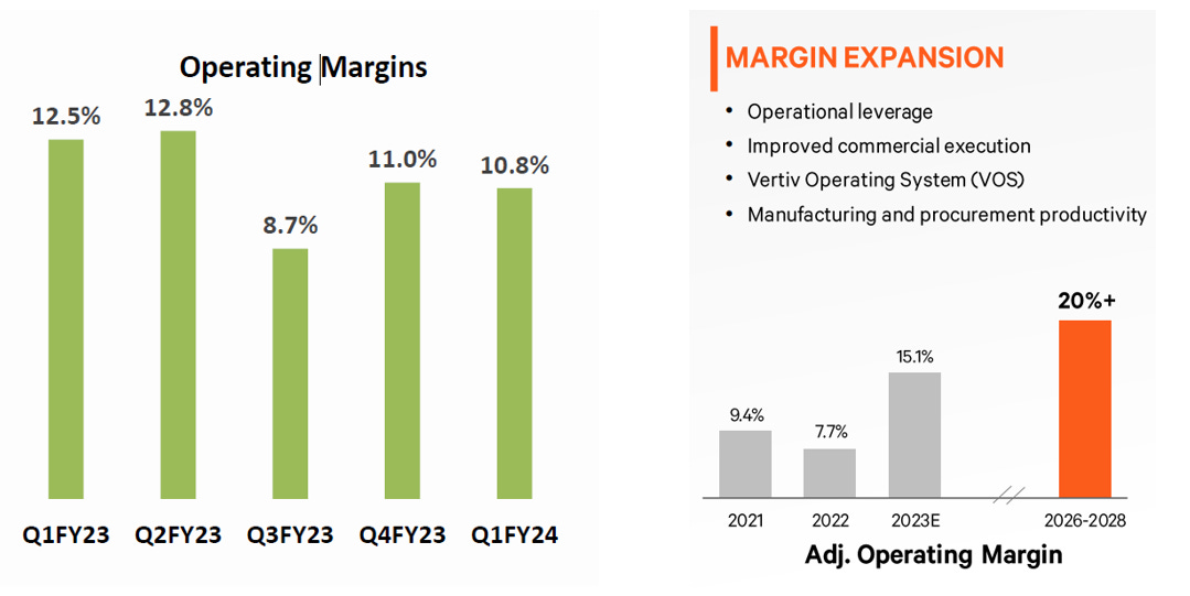 VRT: 33% 營收來自於電力管理 (power management),30% 來自於 熱管理 (thermal management),調整後營業利益率在 FY22 不到 10%,FY23 預估將到 15%,長期展望為 20% 以上;